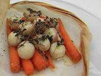 | Вегетерианская горячая закуска из моркови с турнепсом.Состав:турнепс — 7 штук;морковь — 7 штук;немного тимьяна, орегано;оливковое и сливочное масло, соль, смесь перцев — по вкусу.