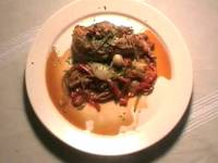 | Рецепт запеченной курицы с перцем.Состав:грудка — 1 штука;перцы — 2 штуки;черри — 7 штук;лук — 1 штука;красное вино, соль, масло, уксус, бульон, петрушка, бекон, панировочные сухари.