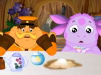 | Наливая Генералу Шеру чай, Лунтик пачкает белоснежную скатерть. Как вывести пятно? Конечно, стирки не избежать! Надо только вспомнить, как это обычно делает баба Капа: насыпает какой-то порошок, отчего бывает пена, что-то трет. Но у деда с внуком вместо стирки получается нечто более интересное, а скатерть в результате становится сине-зеленой. Ничего! Баба Капа их не ругает, и они все вместе раскрашивают новую нарядную скатерть. А пятно от чая станет солнышком!